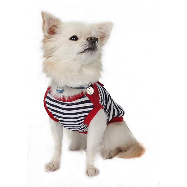 Marinière rayée blanc et bleu, en tissu jersey viscose, assortie d’un foulard rouge.